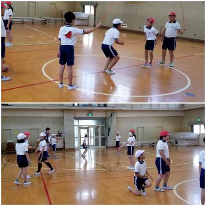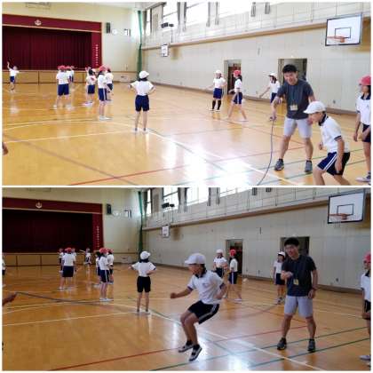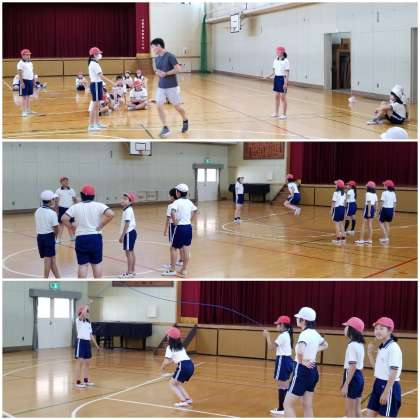 グループごとの練習では、縄を跳ぶタイミングを「はい!」という掛け声で教え合っています。