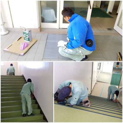 講堂入口だけでなく、プールへ上がる階段周辺も美しく大変身させていただきました。