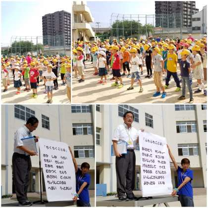 児童朝会で、【ふわふわことば】と【ちくちくことば】について話を聞きました。