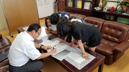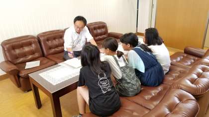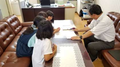ラジオ体操コンクールに向けて、校長先生と6年生が会議をしています。