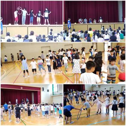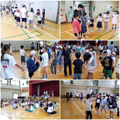 班長を先頭に「フラフープくぐり」に挑戦です!