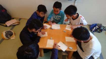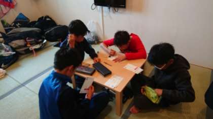 お風呂の待ち時間に、部屋でハガキを書いています。