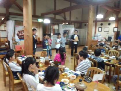 避難訓練の後、美味しい夕食を頂きます。楽しい顔が一杯です。