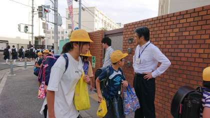 校門で、子ども達を笑顔で出迎えてくださいました。