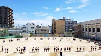 運動場では、5・6年生が「組体操」の隊形移動確認をしています。