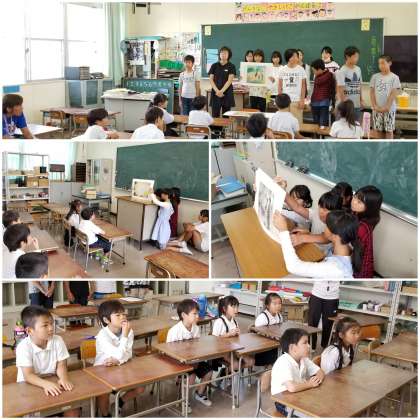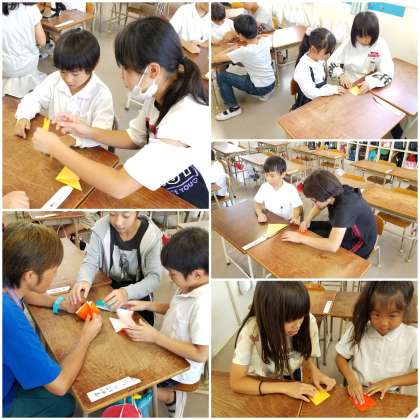 1年生に向けて、紙芝居の読み聞かせをした後、一緒に千羽鶴を折っています。