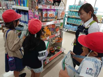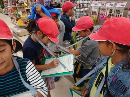 今日の午前中、「スーパーマーケットにお客さんがたくさん集まるひみつ」を調べるために、学校の近くのスーパーマーケットに見学に行きました。