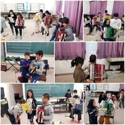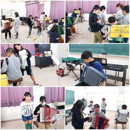 アコーディオンで、和音の響きを確認しています。