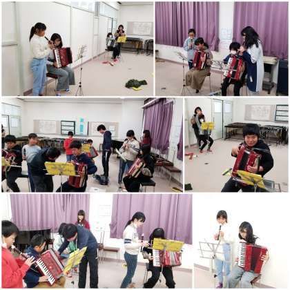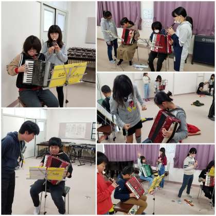 ペアの友達と教え合って、アコーディオンの演奏を楽しんでいます。