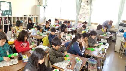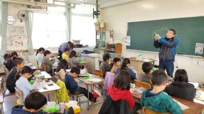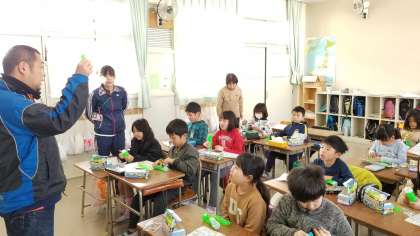 先生の説明を一生懸命聞きながら、豆電球を使っての懐中電灯づくりをしています。