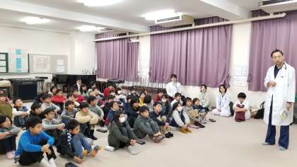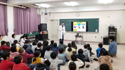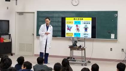 西淀病院の先生に講師になっていただき、悪の3兄弟「ニコチン・タール・一酸化炭素」など、わかりやすく【たばこの害】について教えていただいています。