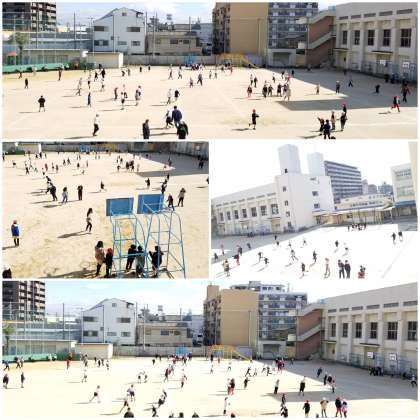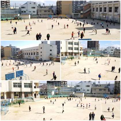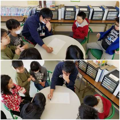 職員室横の廊下では、卒業お祝い集会に向けて実行委員の子ども達が話し合いをしています。