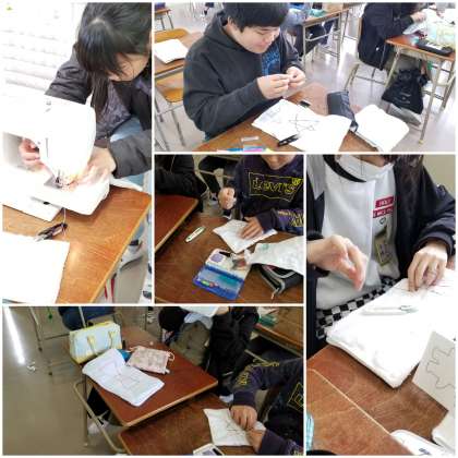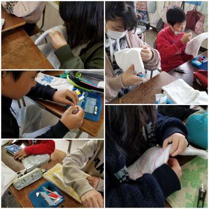 受け取って在校生が、このぞうきんを使って校内をきれいにしてくれることを願って、一針一針ていねいに縫います。