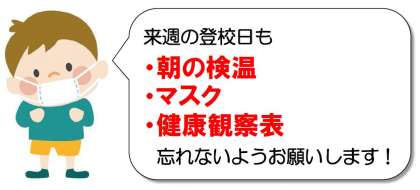 引き続き、「朝の検温」「マスク」「健康観察表」を忘れないようご協力ください。