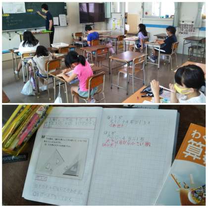 三角定規の角の大きさについて学習しました。二つの角を合わせたり引いたりするといろんな角の大きさが求められます。