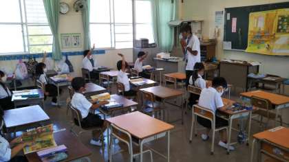 1年生はしっかり手を挙げて先生に当てられるのを待っています。毎日登校するようになって2週目。歌島小学校に慣れてきたね。