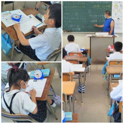「長い針がひとまわりした時間が、1時間=60分間」であることを学習しています。