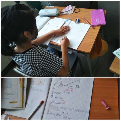 分度器で角度を測って三角形をかきます。細かい目盛りを見間違えないようにみんな真剣です。
