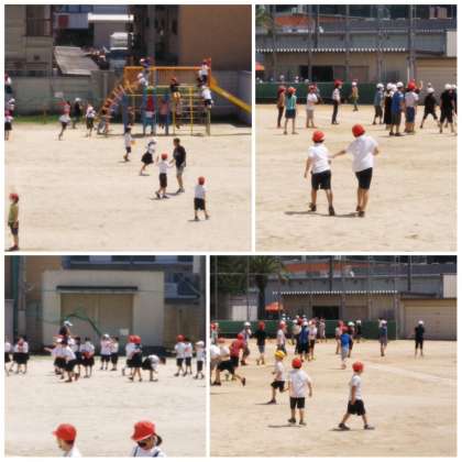 休み時間、運動場ではたくさんの児童が元気に遊んでいます。暑さが心配ですが、子どもたちは楽しそうです。