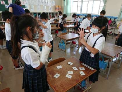 2人ペアになって、数字のカードで10になる組み合わせを作っています。