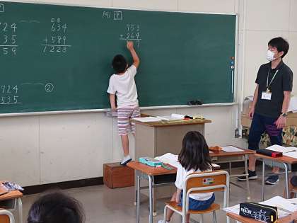 「753+264」の筆算を子どもたちが交代で解いていきます。