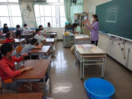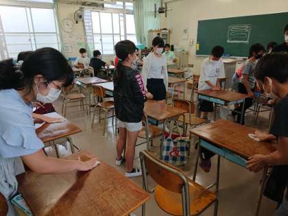 授業の終わりに、「重曹」を使って一人一人自分の机をきれいにしました。