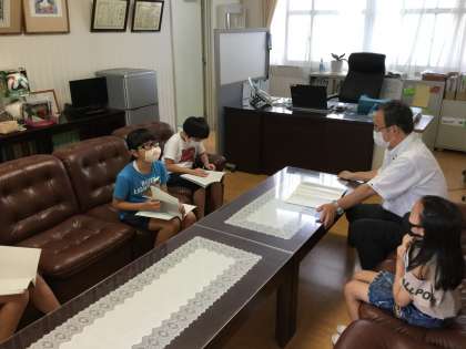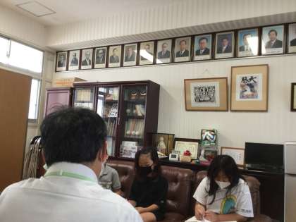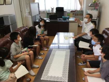 何人かの子どもたちが向かった先には、校長室!!校長先生に「今までに何人の校長先生がいましたか」や「歌島小学校は何年前からありますか」などのインタビューをして情報を集めていました。子どもたちは「知らなかった!」「びっくりした!」と初めて知る情報に驚いている様子でした。
