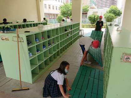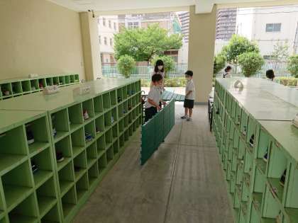 2年生と6年生が協力してくつ箱のすのこを動かしています。