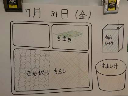 今日の献立は、「きんぴらちらし」「すまし汁」「ちまき」です。