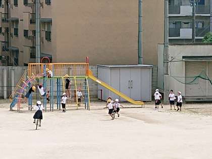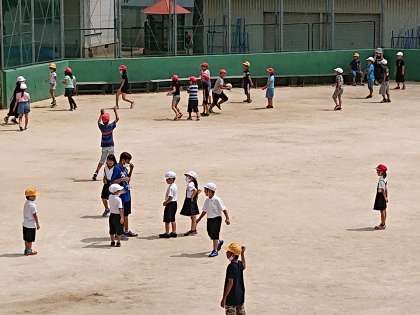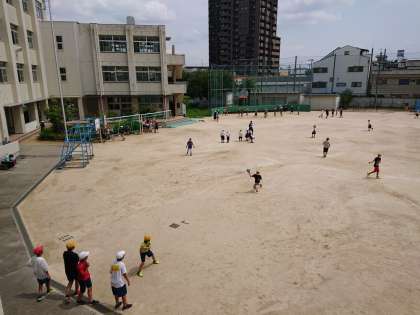 暑さに負けず、たくさんの子どもたちが運動場で遊んでいます。