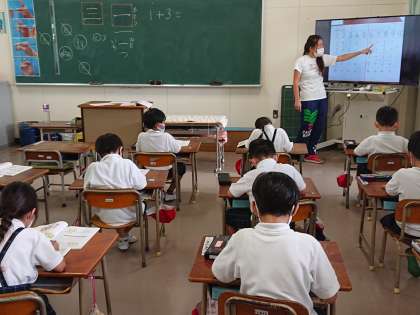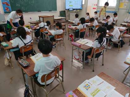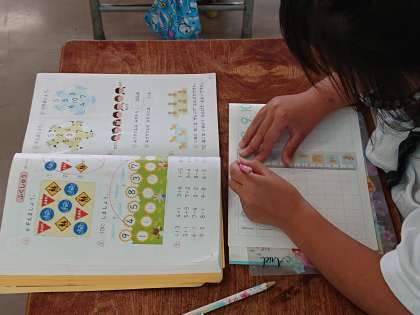 1年生では、たし算の学習などの復習問題を解いていました。