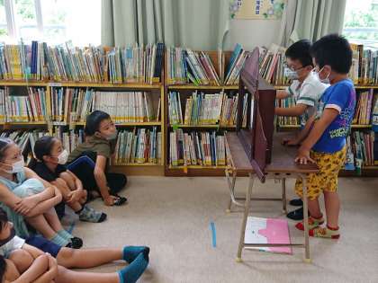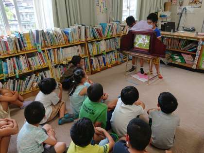 図書室で、学級のみんなに紙芝居を読んで聞かせています。
