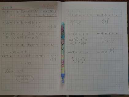 顕微鏡で花粉を観察して、ノートにまとめています。