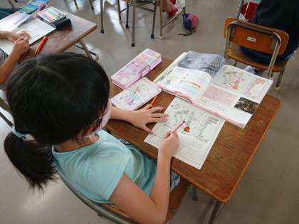 教科書の資料を見て気付いたことをワークシートにまとめています。