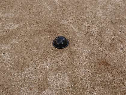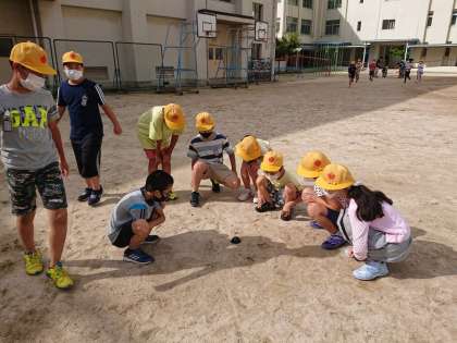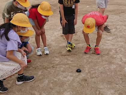 運動場に置かれた黒い半球を子どもたちがのぞいています。