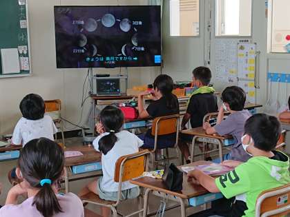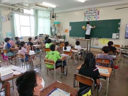 ドッジボールを使って、月の満ち欠けの説明をしています。