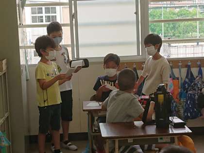 「新しい集会様式」・・・講堂で全校児童が集まることをさけるため、集会委員会が各教室に出向き、教室で「お絵かき伝言ゲーム」をしました。
