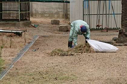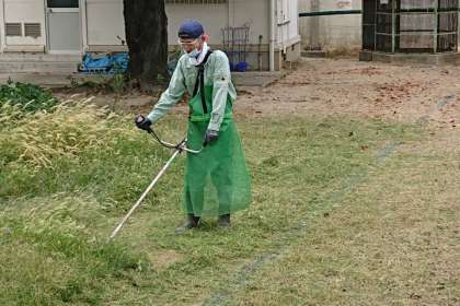 管理作業員が、刈払機を使い、バックネット裏の雑草をきれいに刈っています。