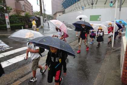 雨の中、子どもたちが傘をさして登校してきました。