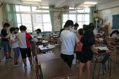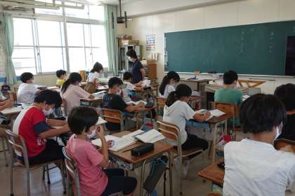 自分の考えを、ノートに書いたことを、友達どうし交流しています。