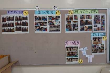 家庭科室には、5・6年の子どもたちが家庭科の時間に実習した様子の写真が掲示しています。