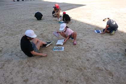 運動場で3年生たちが何やら調べています。