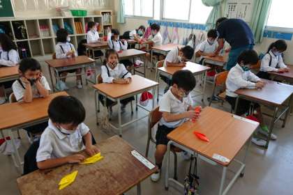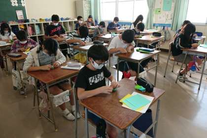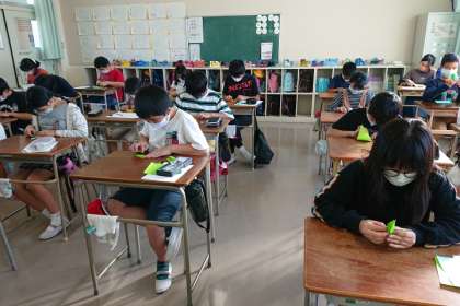 修学旅行で平和公園に捧げる折り鶴を、全校の子どもたちが折っています。
