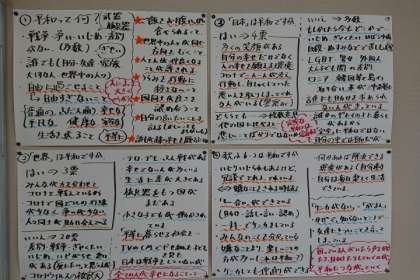 修学旅行に向けての平和学習で、平和とはどんなことか、今、世界や日本は平和かどうか、自分たちの学級は平和かどうか、一人一人が考えたことをまとめ、教室に掲示しています。
