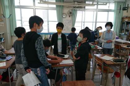 早くできた人が、まだできていない人に一生懸命教えています。
