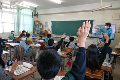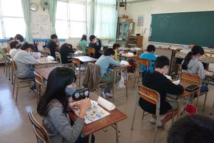 絵の中の施設や建物の名前の、英語での言い方を練習しています。