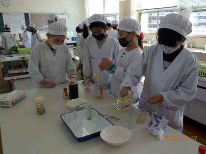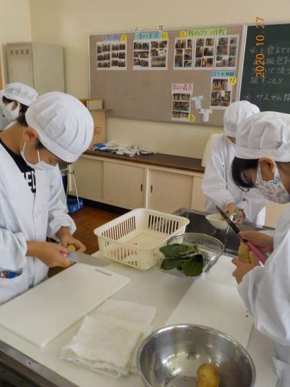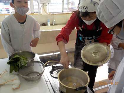 じゃがいも、青菜などの野菜をゆでる実習をしています。