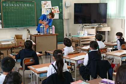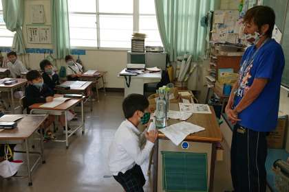 入れ物に入った水のかさは、どれがいちばん多いか予想しています。