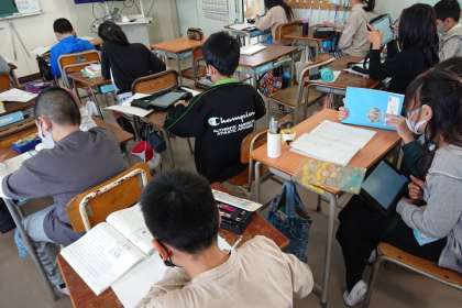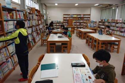 和の文化について説明するため、図書室の本やタブレットを使って調べています。