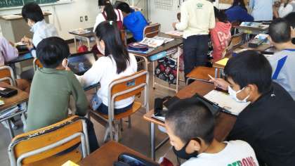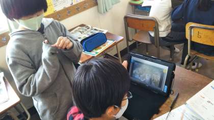 流れる水のはたらきについて学習している5年生。タブレット端末で教科書に載っているQRコードを読み取って吉野川の上流、中流、下流の映像を見ています。川の幅や水の流れの速さ、石の大きさなど場所によってどう違うのか友達と映像を見返しながら一生懸命考えています。